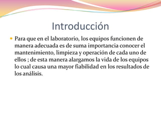 Este documento describe el uso, calibración y mantenimiento de varios equipos de laboratorio comunes, incluidas balanzas granatarias y analíticas, baños de María, y autoclaves. Explica los pasos para usar cada equipo correctamente y realizar mantenimiento preventivo como limpieza periódica para garantizar su funcionamiento adecuado.