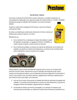 Este documento proporciona instrucciones para limpiar un sistema de enfriamiento de vehículo utilizando un producto llamado FLUSH + CLEANER. Describe los pasos para agregar el producto al sistema con el motor en marcha, drenar y enjuagar el sistema dos veces con agua desmineralizada, y volver a llenarlo con anticongelante al 97% de concentración. Recomienda una concentración adecuada de anticongelante del 50% para un buen funcionamiento del sistema de enfriamiento.