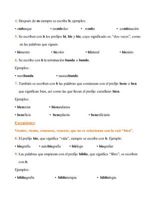 Este documento presenta 17 reglas para el uso correcto de la letra b en español. Algunas de estas reglas indican que se escribe b en palabras que comienzan con prefijos como bi- o en terminaciones como -bilidad o -bur. Otras reglas cubren el uso de b en verbos como haber o escribir. El documento también incluye reglas para el uso de las letras v, s, c, z y x.