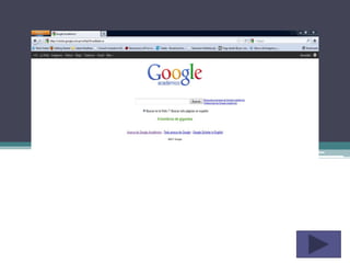 Este documento presenta cómo usar Google Académico para buscar artículos académicos. Explica que Google Académico es un buscador especializado en documentos académicos como artículos, libros y tesis. Detalla diferentes estrategias para buscar, incluyendo por autor, materia, título o búsqueda avanzada. También provee consejos como incluir "filetype: pdf" o "peer reviewed" para mejorar los resultados. El objetivo es ayudar a estudiantes a acceder a información académica de manera gratuita