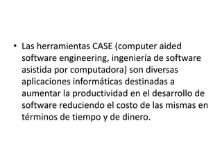 Este documento describe las herramientas CASE (ingeniería de software asistida por computadora) y sus objetivos. Las herramientas CASE son aplicaciones que aumentan la productividad en el desarrollo de software reduciendo los costos de tiempo y dinero. Sus objetivos incluyen mejorar la productividad, calidad y planificación de proyectos de software, así como automatizar tareas como el desarrollo, documentación y pruebas.