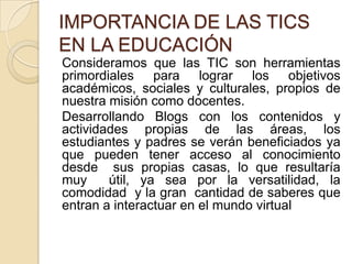 El documento describe la importancia de las tecnologías de la información y la comunicación (TIC) en la educación. Al desarrollar blogs con contenido educativo, los estudiantes y padres pueden acceder al conocimiento desde sus casas de manera versátil y cómoda. También presenta un código de conducta para el buen uso de las TIC que incluye respetar a los demás, ejercer la libertad de manera responsable y proteger la privacidad propia y ajena. Finalmente, explica que las TIC brindan ventajas para el apre