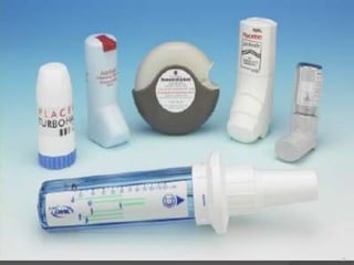 Este documento describe los diferentes tipos de dispositivos inhalatorios, incluyendo cartuchos presurizados, inhaladores de polvo seco, nebulizadores y cámaras de inhalación. Explica sus usos, ventajas, inconvenientes y técnicas de administración, destacando que la elección del dispositivo depende de la capacidad del paciente. El objetivo es identificar el sistema más adecuado para cada paciente con enfermedades como asma o EPOC.