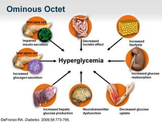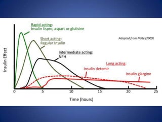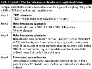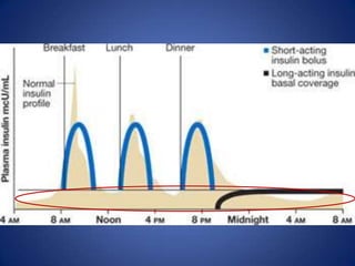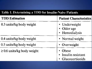 Este documento proporciona recomendaciones sobre el uso de insulina para tratar la hiperglucemia en pacientes hospitalizados. Controlar los niveles de glucosa sin causar hipoglucemia es un desafío, especialmente considerando factores como enfermedades agudas y dietas inconsistentes. El esquema de insulina basal más bolos es la mejor opción, proveyendo un nivel constante de insulina basal y ajustando las dosis de bolo con las comidas y correcciones. La insulina NPH debe evitarse debido a sus picos