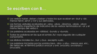 El documento proporciona reglas sobre el uso de las letras B, V, S, C y Z en palabras del español. Explica que la B se usa en verbos como haber y deber, palabras que terminan en -bilidad, y sílabas iniciales como bu-. La V se usa después de consonantes como d, b, n, y en palabras que comienzan con eva-. La Z se usa delante de vocales a, o, u, y delante de c sonando como k. La C se usa en verbos que terminan en -cer y palabras que terminan en -cia