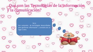 Las Tecnologías de la Información y la Comunicación (TIC) son conjuntos de tecnologías desarrolladas para gestionar y enviar información de un lugar a otro. Se dividen en tecnología de la información, que digitaliza contenidos, y tecnología de la comunicación, que incluye televisión, radio y telefonía. Los docentes deben conocer y capacitarse en el uso de las TIC, asumiendo un rol de facilitadores en lugar de poseedores de la información. Las TIC pueden integrarse en el aula como canal de comunicación, med