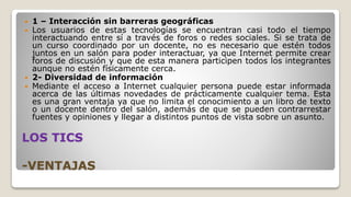El documento describe las ventajas y desventajas de las Tecnologías de la Información y la Comunicación (TICs) en la educación. Entre las principales ventajas se encuentran la interacción sin barreras geográficas, acceso a diversa información y aprendizaje a ritmo propio. Algunas desventajas son las distracciones en Internet, aprendizaje superficial y procesos educativos menos humanos.
