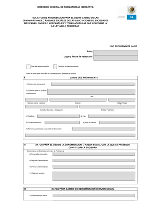 Este documento presenta un formato para solicitar la autorización para el uso o cambio de denominaciones o razones sociales de asociaciones o sociedades mexicanas. El formato solicita información sobre el promovente, la(s) denominación(es) actual(es) y propuesta(s), y el régimen jurídico. También incluye consideraciones generales sobre el llenado del formato y la protección de datos personales.