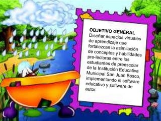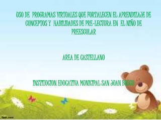 Este documento describe un proyecto que utiliza programas virtuales para fortalecer las habilidades pre-lectoras en niños preescolares. El proyecto busca sensibilizar a los estudiantes sobre el uso de la tecnología en el aula a través de software educativo. Los docentes implementaron varias actividades usando programas como Childsplay y software de Office para desarrollar habilidades argumentativas y tecnológicas. Los resultados mostraron que los estudiantes pudieron compartir ideas y participar activamente, mejorando sus habilidades pre-lect