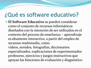 Este documento describe el software educativo, incluyendo su definición, propósitos, clasificaciones, funciones, características, ventajas y desventajas. El software educativo se define como recursos informáticos diseñados para ser usados en el proceso de enseñanza-aprendizaje de manera interactiva utilizando recursos multimedia. Se clasifican en de consulta, tutoriales, ejercitación, simulación, lúdicos y micro mundos. Sus funciones incluyen informar, instruir, motivar, evaluar, investigar y expresarse
