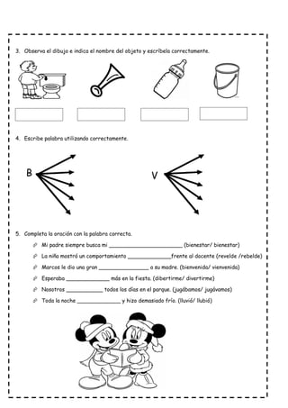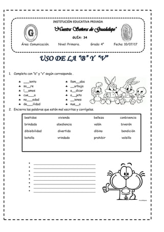 El documento presenta una guía educativa con ejercicios de corrección ortográfica y completado de palabras. Incluye encerrar palabras mal escritas y corregirlas, completar oraciones con palabras correctas, y escribir palabras correctamente. El objetivo es reforzar conceptos ortográficos en estudiantes de cuarto grado.
