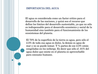 El documento describe la importancia del agua y ofrece consejos para su uso eficiente. Explica que el agua es un recurso crítico pero escaso, y que solo el 0.01% del agua dulce es aprovechable. Luego, recomienda medir el consumo actual de agua, seguir su evolución para detectar fugas, revisar la instalación para mejorar la eficiencia, y utilizar una lista de verificación para promover un uso responsable del agua.
