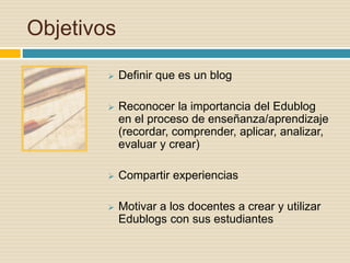 El documento presenta una conferencia sobre el uso de blogs (edublogs) como estrategia de enseñanza y aprendizaje. Explica qué es un blog y sus características, los tipos de edublogs, y cómo se pueden utilizar los edublogs en el aula para motivar a los estudiantes y apoyar la enseñanza de diferentes asuntos a través de publicaciones, discusiones y trabajos colaborativos. También discute técnicas de evaluación y taxonomías de aprendizaje relevantes para la era digital.