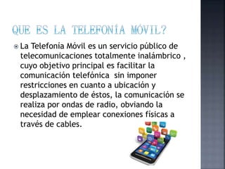 El documento describe la telefonía móvil, incluyendo que consiste en una red de antenas y teléfonos móviles que se comunican a través de ondas electromagnéticas, y que permite la comunicación sin importar la ubicación del usuario. También discute las ventajas de la telefonía móvil como facilitar la comunicación y transportar el dispositivo fácilmente, así como algunos riesgos como la adicción y efectos en la salud.
