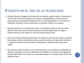 El documento presenta varias normas de etiqueta para el uso apropiado de la tecnología, especialmente celulares. Se debe dar prioridad a la persona presente físicamente y evitar usar el celular durante las comidas o en lugares públicos. El documento también explica brevemente qué es un teléfono móvil, sus ventajas y desventajas, y cómo funciona la telefonía móvil. Finalmente, se discuten valores como el respeto, la responsabilidad y la libertad que deben demostrarse en el uso del celular.