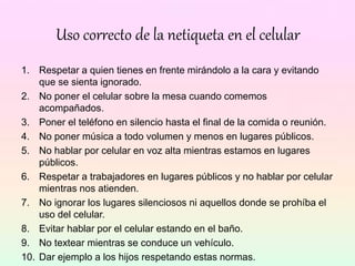 Uso correcto dela netiqueta en el celular 1. Respetar a quien tienes en frente mirándolo a la cara y evitando que se sienta ignorado. 2. No poner el celular sobre la mesa cuando comemos acompañados. 3. Poner el teléfono en silencio hasta el final de la comida o reunión. 4. No poner música a todo volumen y menos en lugares públicos. 5. No hablar por celular en voz alta mientras estamos en lugares públicos. 6. Respetar a trabajadores en lugares públicos y no hablar por celular mientras nos atienden. 7. No ignorar los lugares silenciosos ni aquellos donde se prohíba el uso del celular. 8. Evitar hablar por el celular estando en el baño. 9. No textear mientras se conduce un vehículo. 10. Dar ejemplo a los hijos respetando estas normas.