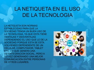 El documento aborda la netiqueta en el uso de la tecnología y los celulares, destacando las ventajas y desventajas del uso de la telefonía móvil. Explica que, aunque el móvil facilita la comunicación y la movilidad, también presenta riesgos para la salud y puede generar dependencia. Además, describe la estructura de la telefonía móvil y la evolución de los celulares, enfatizando la importancia de la responsabilidad y el respeto en su uso.