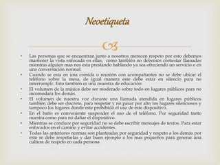 El documento presenta lineamientos sobre el uso respetuoso del celular, destacando la importancia de mantener la atención en las personas durante conversaciones y no usarlo en la mesa durante comidas. Además, se debe evitar el uso del celular en baños y conducir sin distracciones. El objetivo es fomentar la cortesía y seguridad de todos.