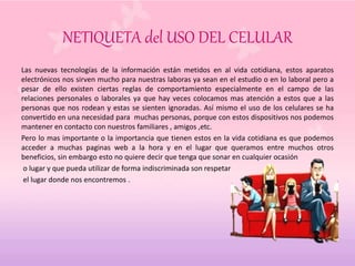 El documento habla sobre el uso adecuado del celular. Explica que a pesar de los beneficios de la tecnología móvil, es importante respetar a las personas presentes y el contexto. Recomienda silenciar el celular durante comidas y reuniones, evitar hablar en voz alta en lugares públicos como hospitales o iglesias, y no textear cuando se conduce para prevenir accidentes. Además, señala la importancia de dar ejemplo a los hijos sobre el buen uso del celular.
