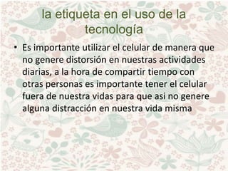 El documento aborda el uso responsable del celular, enfatizando la importancia de evitar distracciones en interacciones sociales y el respeto hacia quienes nos rodean. Además, explica cómo funciona la telefonía móvil, sus ventajas y desventajas, y diferencia entre teléfonos móviles y fijos. También se mencionan valores como responsabilidad, respeto y libertad en el uso de la tecnología, sugiriendo prácticas para un uso adecuado del celular.