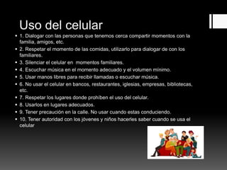 El documento aborda el uso responsable del celular, destacando la importancia de dialogar en entornos familiares y respetar las normas sobre su uso en espacios prohibidos. También explica la tecnología detrás de la telefonía móvil y las ventajas y desventajas de su uso, enfatizando la necesidad de aplicarse valores como responsabilidad, respeto y verdad. Finalmente, se menciona la convergencia de la telefonía móvil y fija, donde los usuarios pueden elegir la conexión más conveniente.