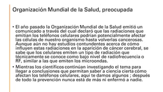 El documento discute los riesgos y beneficios del uso del celular por adolescentes, así como consejos para los padres. Algunos riesgos incluyen radiación, distracción al conducir, bullying y sexting. Los beneficios son la seguridad y comunicación. Se recomienda que los padres establezcan normas claras sobre el uso, como no usarlo mientras conducen, no enviar contenido sexual y responder llamadas de los padres.