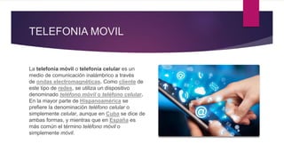 La telefonía móvil utiliza ondas electromagnéticas para permitir la comunicación a través de dispositivos inalámbricos llamados teléfonos celulares. Ofrece ventajas como la portabilidad y la conexión global, pero también presenta desventajas como la dependencia y efectos negativos en la salud y las relaciones sociales. Además, se destacan diferencias entre celulares y teléfonos fijos, así como valores importantes a considerar al usarlos, como el respeto y la responsabilidad.