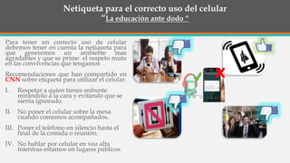 El documento aborda la importancia de la netiqueta en el uso del celular, enfatizando el respeto mutuo durante interacciones en persona y brindando recomendaciones sobre cómo comportarse adecuadamente, como evitar usar el teléfono en comidas y lugares públicos. También explica el funcionamiento de la telefonía móvil, sus ventajas y desventajas, así como los valores que se deben adoptar al utilizar estos dispositivos, como la responsabilidad y el respeto. Se concluye con reflexiones sobre el uso consciente y moderado del celular para evitar problemas de adicción y mantener la comunicación efectiva.