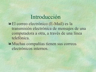 El documento habla sobre el uso del correo electrónico (e-mail). Explica que el e-mail permite enviar y recibir mensajes y documentos de una computadora a otra a través de una línea telefónica. Detalla que para acceder al correo electrónico se necesita una cuenta con un proveedor de internet y menciona algunos programas como Outlook Express e Internet Explorer. Además, describe los componentes básicos de una dirección de correo electrónico y algunos dominios comunes.