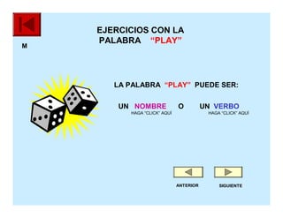 El documento presenta ejercicios sobre el uso de la palabra "play" como verbo o nombre en diferentes oraciones. Explica que "play" puede ser un verbo cuando une al sujeto con el complemento, o un nombre cuando aparece antes o después de un verbo. Luego, proporciona oraciones y posibles respuestas para identificar el significado de "play" en cada caso.