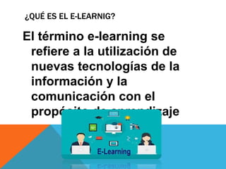 El documento proporciona información sobre el e-learning. Explica que el e-learning implica el uso de nuevas tecnologías para el aprendizaje y describe brevemente su historia desde 1994 hasta la actualidad. También define el e-learning, sus tipos, características, desventajas, mitos y realidades. Finalmente, aclara algunas cosas que el e-learning no es, como únicamente información o la simple transferencia de contenidos presenciales a entornos virtuales.