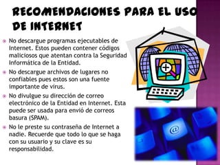 Este documento ofrece recomendaciones para el uso seguro y responsable de Internet, incluyendo no descargar programas o archivos de fuentes no confiables, no divulgar información personal en línea y no prestar cuentas a otros. También discute las ventajas e inconvenientes de Internet, como la facilidad de comunicación frente al riesgo de encontrar contenido no deseado. Finalmente, define las redes sociales, sus características y ejemplos populares como Facebook, Twitter y Flickr.