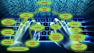 Este documento presenta información sobre Internet, incluyendo sus usos modernos como facilitador de la educación y fuente de información, así como su impacto social a través de la mensajería instantánea y el entretenimiento. También menciona que algunos países como Irán, Arabia Saudita, Corea del Norte y China restringen ciertos contenidos en Internet.
