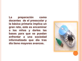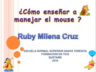 El documento proporciona sugerencias para enseñar el uso del mouse a niños. Explica que los docentes deben preparar a los estudiantes para una sociedad informatizada. Luego, detalla algunas actividades lúdicas y enlaces web para practicar el uso del mouse para aquellos con acceso a Internet. Para aquellos sin acceso, recomienda actividades creativas usando materiales del entorno y presentaciones de PowerPoint.