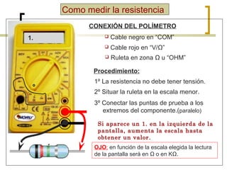 Este documento proporciona instrucciones para medir resistencia, tensión y corriente continua utilizando un polímetro. Explica cómo conectar correctamente el polímetro y cómo aumentar la escala cuando se muestra un "1." en la pantalla. También describe cómo medir valores en circuitos en serie, paralelo y mixtos montados en una placa de circuito impreso.