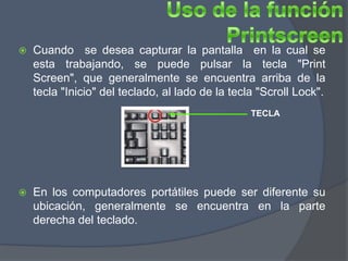 Este documento presenta un resumen de las técnicas para capturar la pantalla y guardar las imágenes capturadas como archivos para evitar que los documentos se hagan pesados. Explica cómo usar la tecla Print Screen para capturar la pantalla actual y pegar la imagen en Microsoft Office Picture Manager o Paint para guardarla como archivo, en lugar de pegarla directamente en un documento. Luego se puede insertar fácilmente la imagen guardada en cualquier documento sin aumentar mucho su peso.