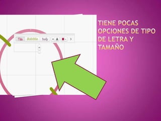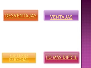 El documento habla sobre la herramienta Prezi para crear presentaciones. Menciona que Prezi es gratis, fácil de usar y se puede acceder desde cualquier computadora con internet. Sin embargo, requiere de conexión a internet, tiene pocos diseños predeterminados y solo está disponible en inglés. Luego presenta una tabla con las actividades más difíciles de realizar en Prezi como introducir animaciones o editar texto. Finalmente concluye que Prezi permite ser creativo y es práctico una vez que se aprende a utilizar.