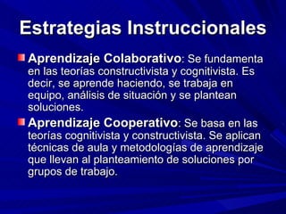 El documento describe cuatro estrategias instruccionales y sus fundamentos teóricos. La estrategia de aprendizaje colaborativo se basa en las teorías constructivista y cognitivista y se aprende trabajando en equipo. La estrategia de aprendizaje cooperativo también se fundamenta en las teorías cognitivista y constructivista y involucra técnicas de grupo. El mapa conceptual se fundamenta en las teorías conductista y cognitivista y analiza esquemas para dilucidar mensajes. La técnica de exposición se