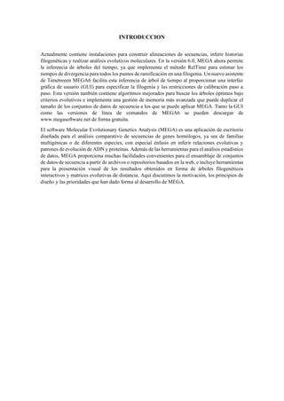 El documento describe el uso del software MEGA DNA para construir un árbol filogenético utilizando 30 muestras del gen 16S. Explica los pasos para recolectar las secuencias del gen 16S de una base de datos, alinear las secuencias y construir el árbol filogenético. Concluye que el software MEGA DNA es útil para este propósito y permite agrupar las especies de acuerdo a su categoría u otras características similares.