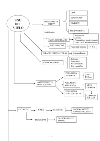 El documento detalla la modificación del uso del suelo según el decreto-ley 8912/77, abarcando aspectos de ordenamiento administrativo y clasificación de áreas urbanas y rurales. Se menciona la importancia del catastro y la regulación de derechos reales en propiedad inmueble. Además, se incluye una bibliografía relevante con leyes y recursos relacionados.