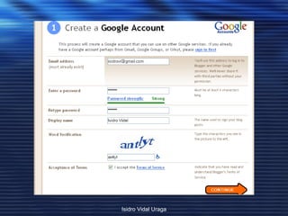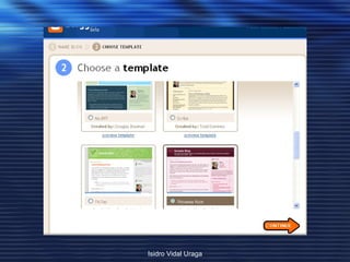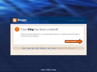 El documento proporciona información sobre la creación y gestión de blogs docentes. Explica qué es un blog, dónde se pueden publicar blogs, y ofrece ejemplos de blogs educativos individuales y colectivos en diferentes asignaturas. También describe los elementos básicos de un blog como artículos, comentarios y categorías, y sistemas para publicar blogs como Blogger, WordPress y otros.