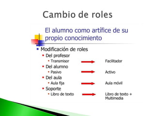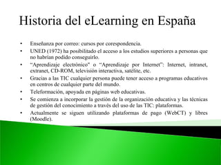 Este documento describe la historia y uso de las tecnologías de la información y la comunicación (TIC) en la educación en España. Explica cómo las TIC han permitido nuevas formas de aprendizaje como la enseñanza a distancia y el e-learning. También discute el uso de plataformas educativas como Moodle y herramientas interactivas como pizarras digitales y vídeo digital en el aula.
