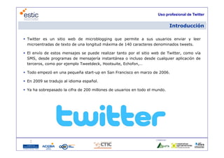 Twitter es un sitio web de microblogging que permite enviar mensajes de hasta 140 caracteres llamados tweets. El documento describe cómo Twitter se ha convertido en una herramienta profesional útil para compartir información, hacer networking, monitorizar tendencias y la competencia. También explica conceptos clave como tweets, seguidores, hashtags y herramientas para administrar cuentas corporativas de Twitter.