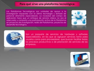 Las plataformas tecnológicas son unidades de apoyo a la investigación equipadas con la última tecnología y personal especializado. Proporcionan paquetes de software y hardware especializados para facilitar procesos productivos. Existen plataformas de código abierto desarrolladas por instituciones educativas y plataformas comerciales como Blackboard y Moodle. Los sistemas de gestión del aprendizaje electrónico (LMS) permiten controlar contenidos y usuarios en cursos en línea mediante herramientas de distribución, comunicación y evaluación