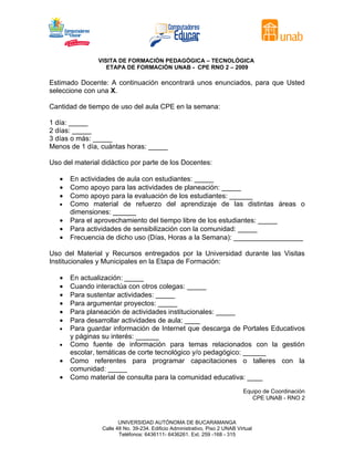 Este documento presenta una encuesta para docentes sobre el uso de recursos tecnológicos y materiales didácticos provistos por la Universidad Autónoma de Bucaramanga. La encuesta incluye preguntas sobre la frecuencia de uso del aula de computación, el uso de materiales didácticos en actividades de aula y evaluación, y el uso de recursos entregados por la universidad para actualización, planeación de actividades y desarrollo de clases.