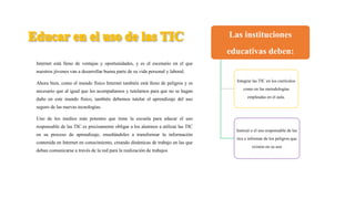 El documento habla sobre la importancia de integrar el uso de las tecnologías de la información y la comunicación (TIC) en los currículos escolares y enseñar a los estudiantes a usarlas de manera responsable y segura. También destaca los peligros comunes en Internet como los fraudes, el acceso a contenido inadecuado y el ciberacoso, y propone algunas medidas que las escuelas y padres pueden tomar para promover un uso positivo de las TIC entre los jóvenes.