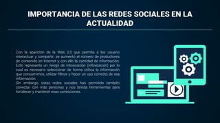 El documento discute la importancia del uso responsable de las tecnologías de la información y la comunicación (TIC) entre los jóvenes. Señala que las redes sociales permiten conectar a más personas pero también representan riesgos como la "infoxicación", por lo que es necesario seleccionar críticamente la información. También destaca que las TIC pueden mejorar el aprendizaje si se enseñan estrategias a los jóvenes para filtrar y seleccionar información de manera adecuada. Además, las instituciones