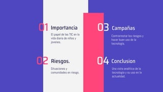 El documento aborda el uso responsable de las TIC y los riesgos asociados, especialmente para niños y adolescentes en un entorno digital. Resalta la importancia de las habilidades para seleccionar información confiable y las medidas de seguridad para proteger la identidad digital. También se mencionan campañas y recursos disponibles para educar sobre estos temas y la necesidad de aceptar la tecnología como herramienta esencial en la vida cotidiana.