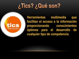 Este documento describe las herramientas multimedia que facilitan el acceso a la información y proporcionan conocimientos para el desarrollo de competencias. Explica la diferencia entre la Web 1.0, que permitía leer información, y la Web 2.0, que permite a los usuarios añadir y modificar contenido, lo que aumenta la participación de los usuarios. También destaca la importancia de saber a quién preguntar, filtrar información útil, relacionar información y comunicarse con otros para generar conocimiento a través de las herramientas digitales