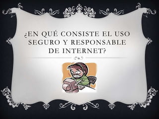 Este documento trata sobre el uso seguro y responsable de Internet. Explica que Internet es una red mundial de conexiones que se usa principalmente para buscar información y usar redes sociales. Señala que el mal uso de Internet puede afectar la salud física y psicológica de las personas y el rendimiento académico de los niños. Identifica algunos usos indebidos como buscar información sin verificar las fuentes, acceder a contenido inapropiado y entregar datos personales a desconocidos. Finalmente, ofrece consejos como mant